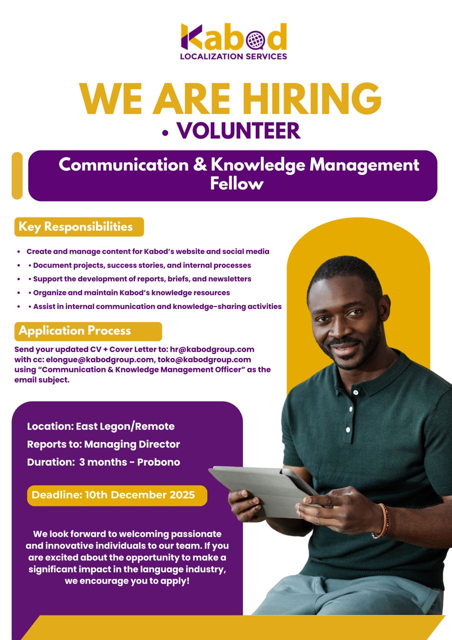 Are you also in the language industry in Africa? Would you also like to be featured in our Knowledge Exchange Series, which highlights the journey and experiences of African language translators, interpreters, computational linguists etc.,? Then, reach out to languages@kabodgroup.com to express interest.